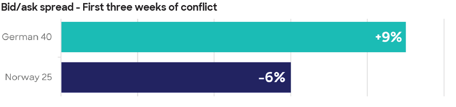 As a result, markets that are nominally part of the same European equity universe are now displaying radically different liquidity profiles. Energy exporting stocks, such as those represented by Norway’s main index, are attracting flows, improving spreads and depth, while energy importing markets are experiencing wider spreads, thinner books, and elevated impact costs.